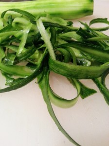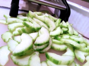 Preheat broiler, grill or gas cooktop. I chose the broiler, so place peppers on a sheet tray and into the oven and cook them until they are black on all sides. Continually turn the peppers with tongs to make sure all sides are charred. Place roasted peppers in a glass bowl and cover tightly with plastic wrap. Let them sit until cool. Using your fingers, peel away all the pepper skins and gently remove the stem and the seeds. Try not to tear the pepper. Lay the pepper flat and slice into one inch sections. This can be done one day ahead. (ok, in my case – three days ahead).