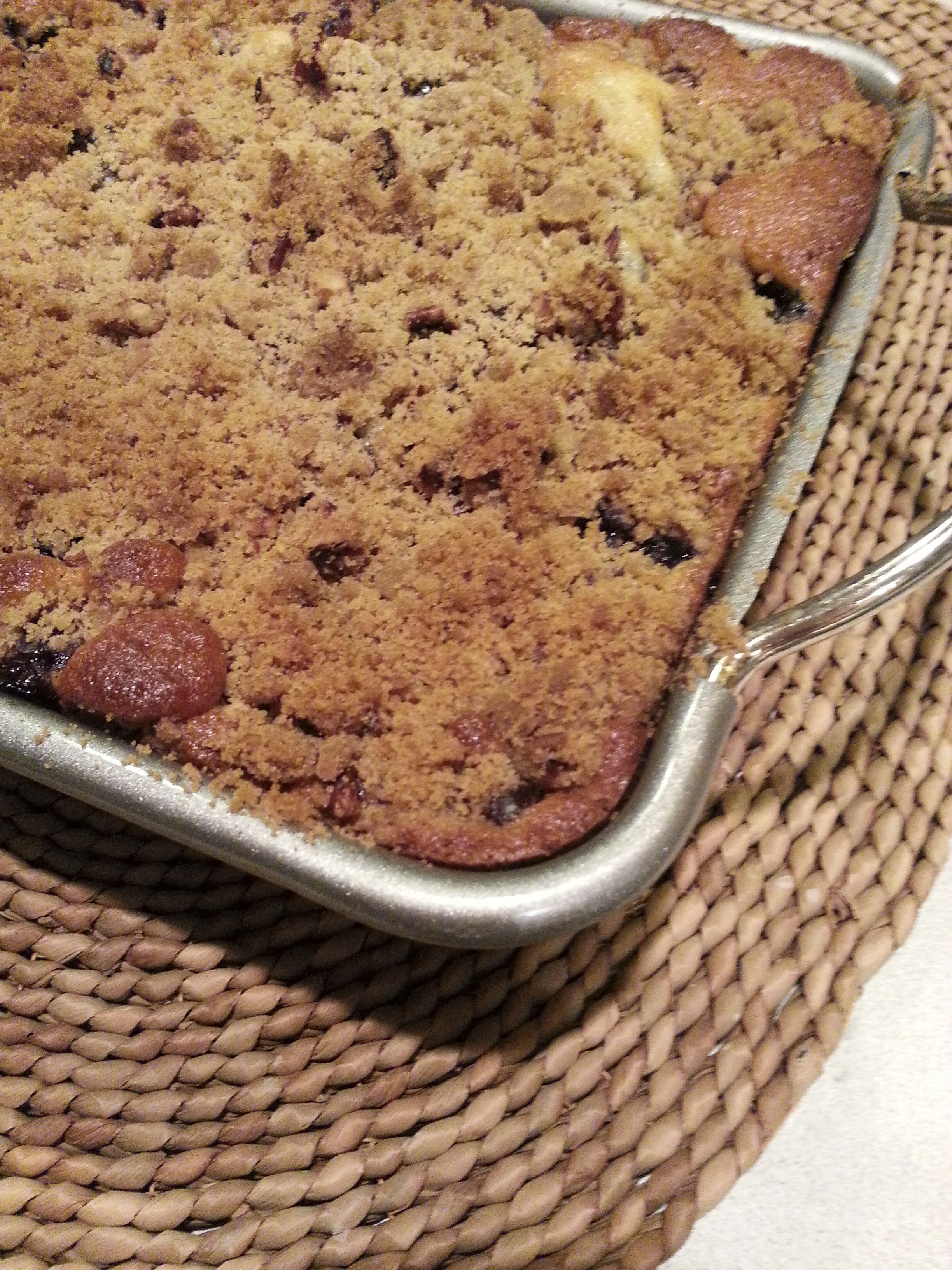 Brown sugar.  It’s cooler than plain white sugar.  Especially when it’s a topping for a cake.  When I see a baked concoction come out of the oven and there is a crumble of brown sugar on the top, it calls to me.  So when I saw this recipe, and the picture of this thick slice of spongy cake with a heavy dose of brown sugar topping, I had to make it.  Plus, who doesn’t love a good coffee cake?  Now my kids have discovered the marvels of brown sugar and its yumminess, so I decided to make this cake for them (and me!).  When they found out I was going to make it, they doubted my abilities, which is completely understandable.  They vividly remember, and continually point out to me and anyone within earshot, that my last dance with blueberries was my sad attempt at making simple blueberry muffins.  I took them out of the oven and then this wave of disappointment came over me.  They came out like green swirly blobs.   My kids just laughed and grabbed a Nutrigrain bar and went and watched iCarly.  Nothing new to them – it’s always an adventure when mommy bakes.  I guess I wasn’t supposed to dump the blueberries in and continually stir to combine.  Lesson learned.  But that didn’t happen this time.  My cake came out perfectly – minus the chunk of brown sugar I picked off the corner.