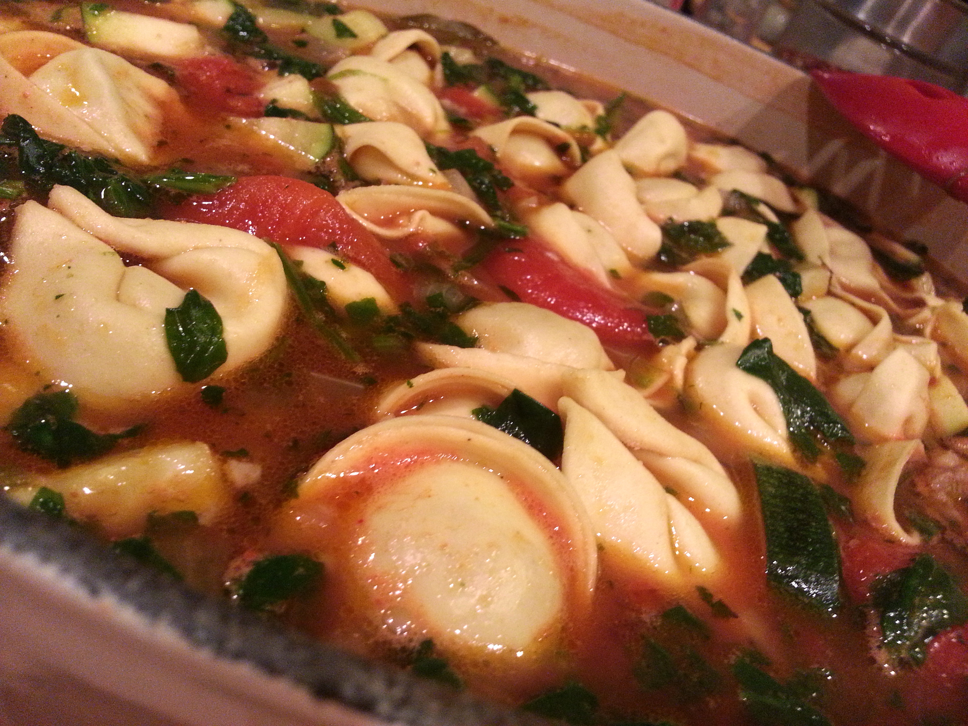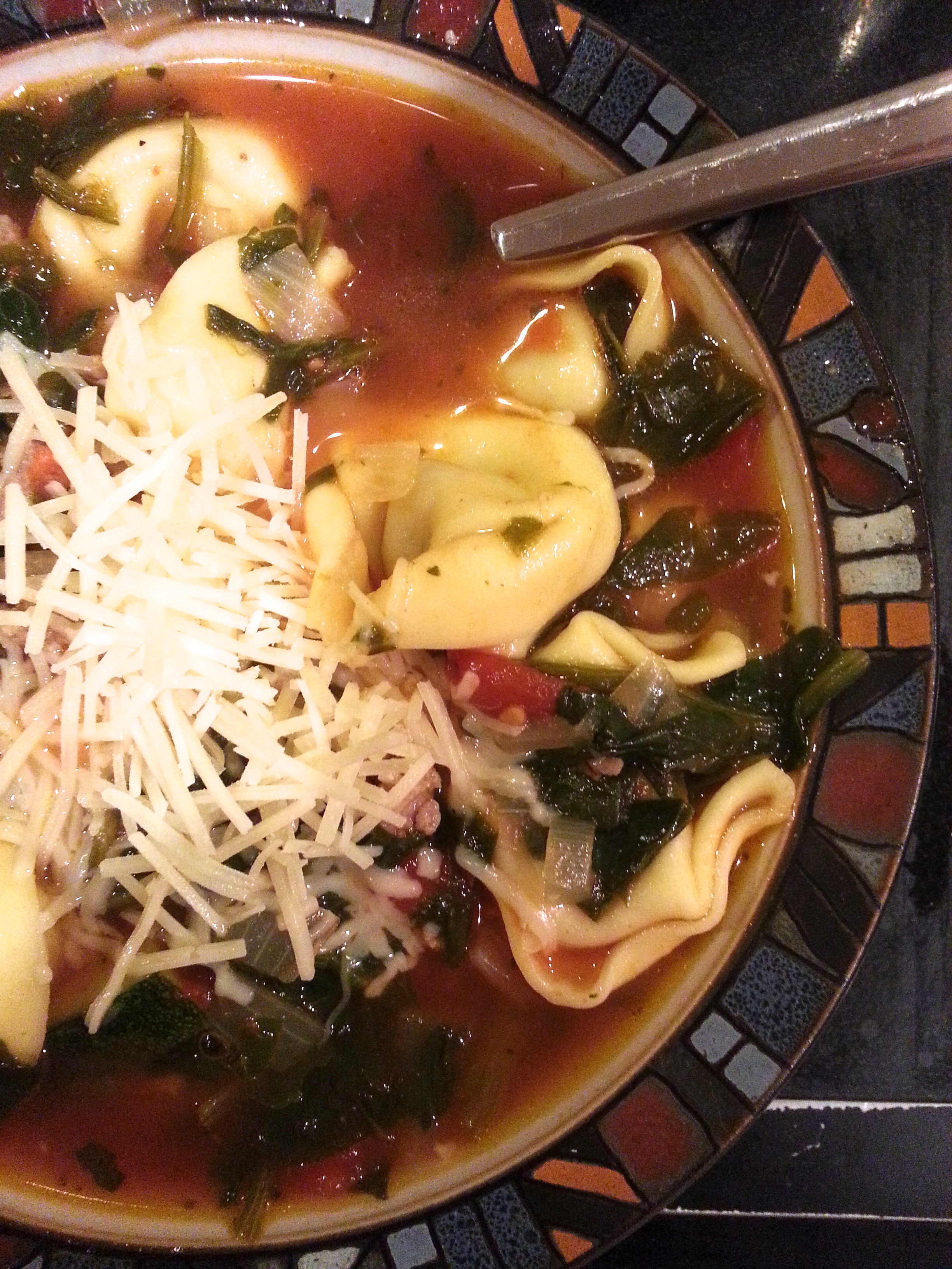 Summer vacation is over and school is back in session, so it is time for my behind to get into the swing of dinner planning with the onslaught of homework, practices, and oh yeah…life. Some people treat the new year as a time for resolutions, but my resolutions have always come during vacation time. I always seem to reflect over that time as to what I can do better or change when I get back. This year on vacation, I decided that it was a goal of mine to really try and plan better for a variety of breakfasts for my kids as well as dinner, since it is often just the three of us eating. I will always have my boxes of mac and cheese at my disposal, but I really wanted to try and cook for all of us this year and not for just the kids. But cooking dinner for just three people, two of whom are under 5 feet tall, is another task. It requires being able to chop onions and trying to remember (and explain) what makes a prime number prime. It also, at times, has you stirring at the stove, all the while instilling fear of what’s to come, because someone was mimicking her brother and so he decided to retaliate with a body slam. I love dinner time during the week. It’s chaotic. But it is a time to savor. You learn so much just sitting and talking. So that is what drives me to plan better, and hope that all the other commitments don’t get in the way (I know I am dreaming). So after doing the guilty pleasure this weekend of perusing Pinterest (I really feel guilty at the amount of time you spend on that site!), I found a recipe that I knew the kids and I would like because of the tortellini, so I made it this week. I loved this soup, and it doesn’t suck up all the broth like some do after putting it in the fridge. I definitely would make this again – and hope that no body slams or nerf injuries occur next time I make it.