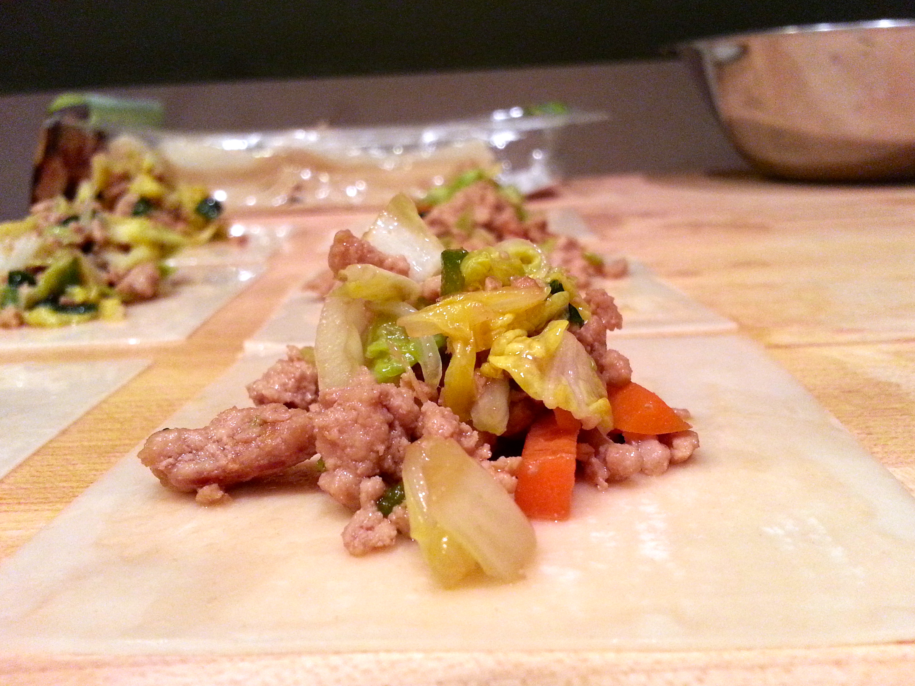 I have always vowed that I wouldn’t be that mother that served dinner like a diner. For the most part, I have upheld that vow. My kids have always been pretty good about trying different things and we are lucky they eat what I serve. That is probably attributed to the fact that they have learned that if they don’t like it, they get the ‘too bad’ face, and the ‘better luck next time!’ shrug (insert emoticon here). Now I am not completely insensitive to their ever-changing preferences or aversions, but I don’t cater to just their favorites either. If I did, I’d be eating orzo and hot dogs everyday. Right now, my daughter seems to be anti-red sauce so she is getting zero sympathy from me in that department. One dish we all can agree on though, is pot stickers. Maybe because it is similar to ravioli or tortellini which the kiddies love. My problem is that I need to be sure I don’t eat 30 of the tiny pockets of yumminess. If you check out the original recipe, it calls for only 8 ounces of pork, whereas I used twice that. I have issue with using parts of packages, or 1/2 of a can of something, so I tend to modify recipes to try to use things in their entirety. This does produce mass amounts of food sometimes, but in most cases, it equals another dish the next day, or a frozen mixture for round two down the road. I would rather refrigerate or freeze a meal, or the mixture for a meal, than have a leftover can of corn or frozen blob of pork.